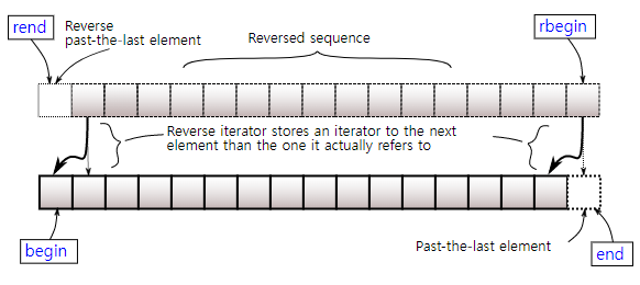 | rend() | reverse_iterator rend() | . array의 첫 번째 원소 이전의 공간을 가리키는 반복자 반환 | |