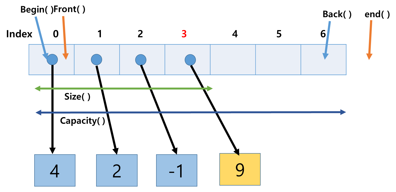 | end() | . iterator로 접근 시 vector의 맨 마지막 위치 다음의 위치를 가리킴 | |