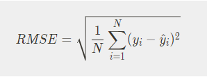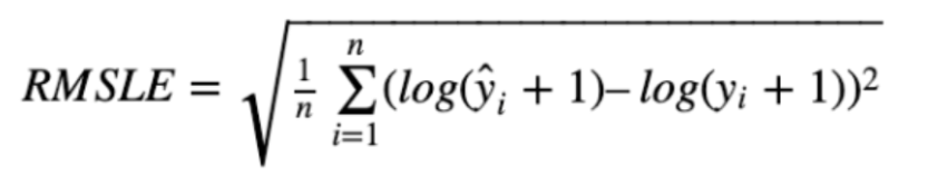 - RMSE =√E[ (x-xi)^2 ) ] 의 real value x와 prediction value xi에 log( ) 를 취한후 residual값의 제곱의 평균에 Root를 취한 값이다.