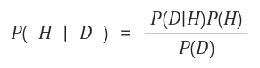 P(H|D) ; 사건 D라는 증거에 대한 사후 확률 ( posterior, 사건 D가 일어난 것을 알고, 그것이 사건 H로부터 일어난 것이라고 생각되는 조건부 확률 )