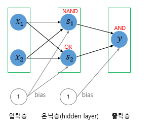 단층퍼셉트론은 값을 보내는 단계(층)[입력층] 와 값을 받아서 출력하는 단계(층)[출력층]로 나뉘어 지는 반면