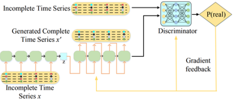 RNN계열의 GRU-D구조를 변형후 GAN구조에 결합한 기술로 GRU-D의 구조에 감쇠를 제거한 GRU-I 구조를 사용하여 생성자와 구분자를 구성하게 된다. GAN구조와 GRU-I 구조를 결합함으로 대립하여 정확성을 높이는 방식의 알고리즘이다 .