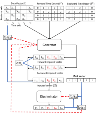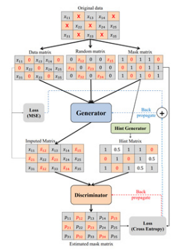 이때 구분자에 벡터 형식으로 몇가지 원시 샘플 데이터의 누락에 대한 정보를 제공후 해당 정보를 기반으로 생성자는 실제 데이터분포에 따라 데이터를 생성하는 방법을 학습하는 알고리즘이다.