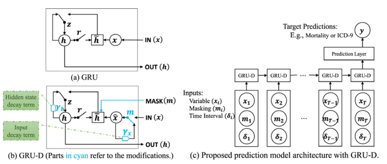 기존 GRU모델 기반에 결측 여부에 대한 마스킹 정보와 결측된 시간 간격을 고려하여 GRU모델에 감쇠율을 추가한 모델이다. 여기서 감쇠율은 다른 실제 값들이 시간 간격 정보에 따른 결측치에 대한 영향 정도에 따라 모델링을 통해 결정되는 구조이다.